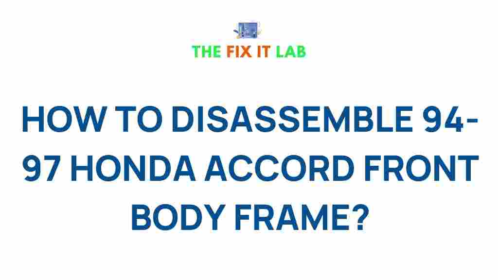Disassembling the front body frame of a 94-97 Honda Accord can be a challenging but rewarding task. By following this step-by-step guide and using the right tools and techniques, you can safely remove and replace components or restore the frame to its original condition. Remember to take your time, follow safety protocols, and handle each part carefully to avoid damaging your vehicle. For additional guidance, check out more DIY repair guides and tutorials online, or visit your local auto repair shop for expert assistance.
